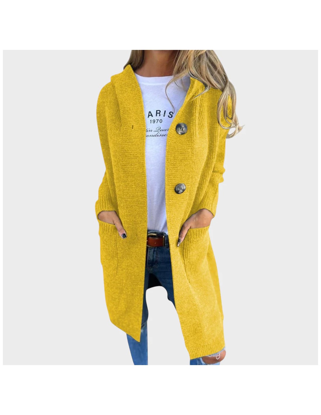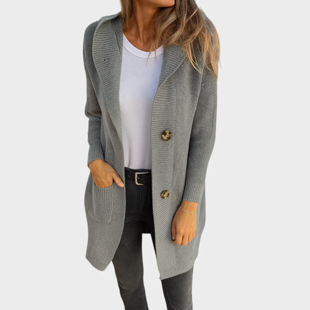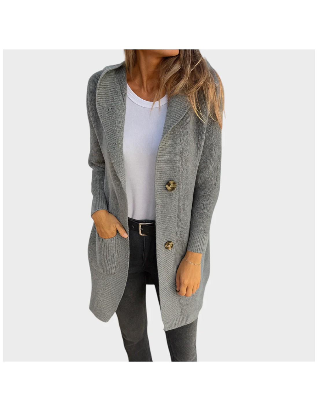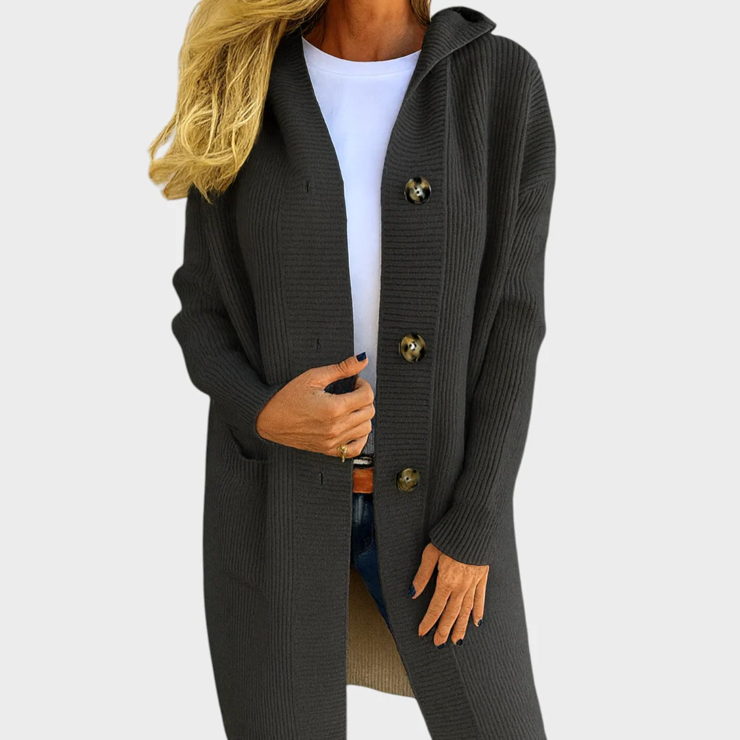 Casaco comprido feminino em malha canelada, com botões frontais e bolsos laterais. Confortável, versátil e elegante, perfeito para looks casuais e dias frios de outono e inverno.