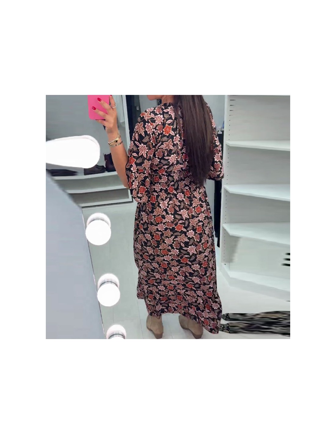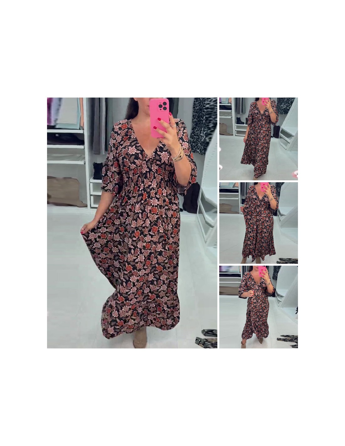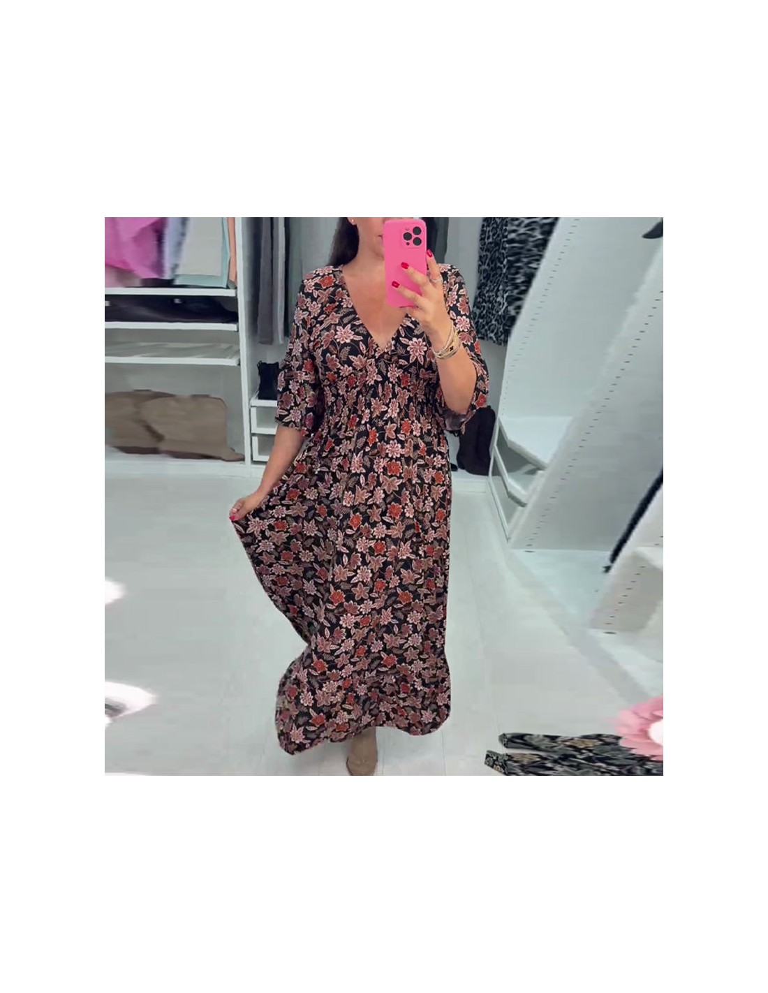 Vestido maxi floral feminino com decote em V e mangas 3/4. Corte fluido, elegante e confortável, perfeito para ocasiões casuais ou especiais. O vestido ideal para quem procura charme e estilo num só look.