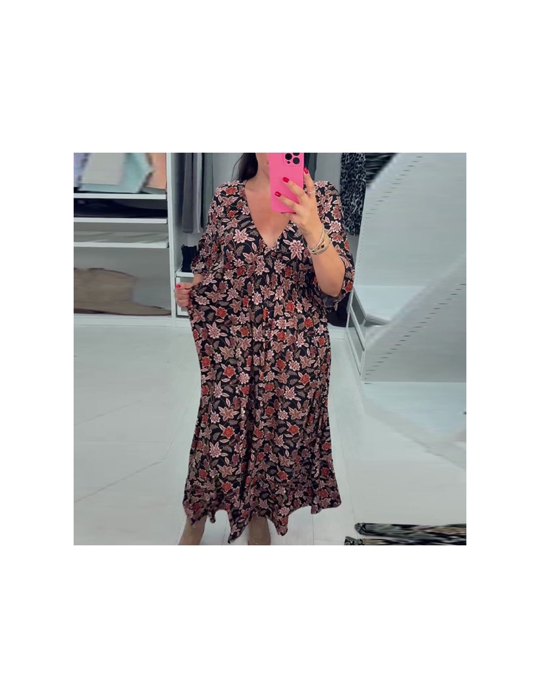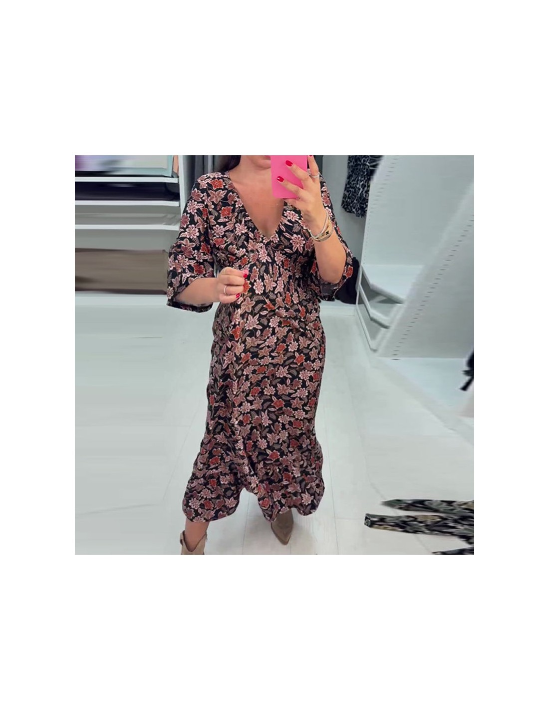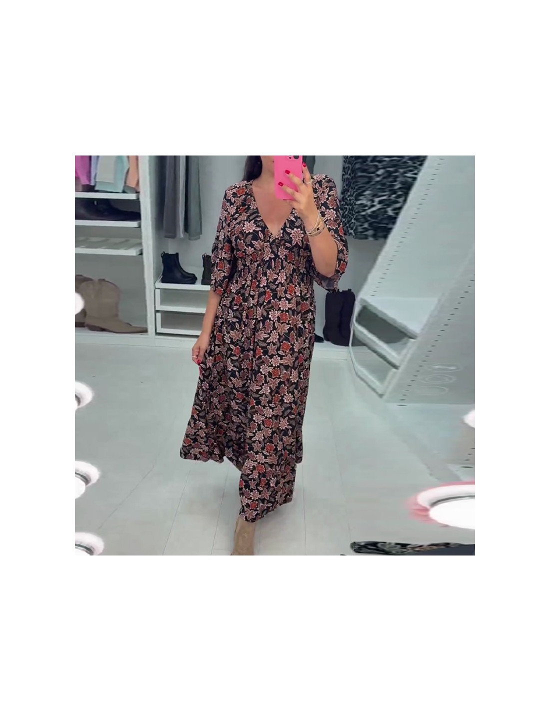 Vestido maxi floral feminino com decote em V e mangas 3/4. Corte fluido, elegante e confortável, perfeito para ocasiões casuais ou especiais. O vestido ideal para quem procura charme e estilo num só look.