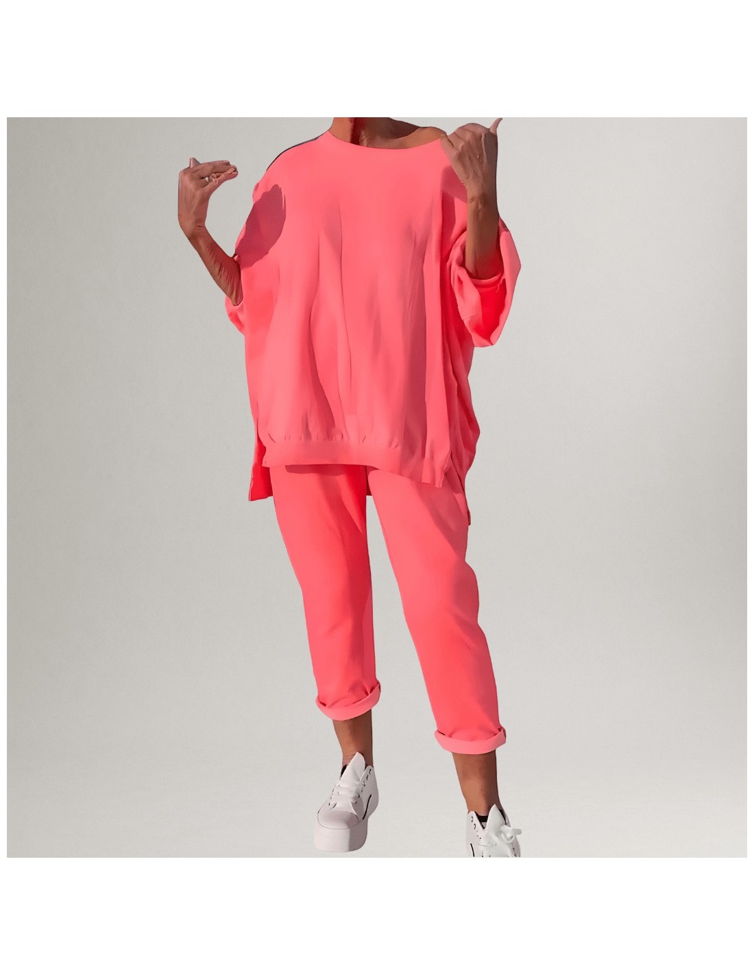 Conjunto feminino oversized em cor vibrante, ideal para conforto e estilo no dia a dia. Inclui camisola larga e calças com corte descontraído, perfeito para looks modernos e casuais.