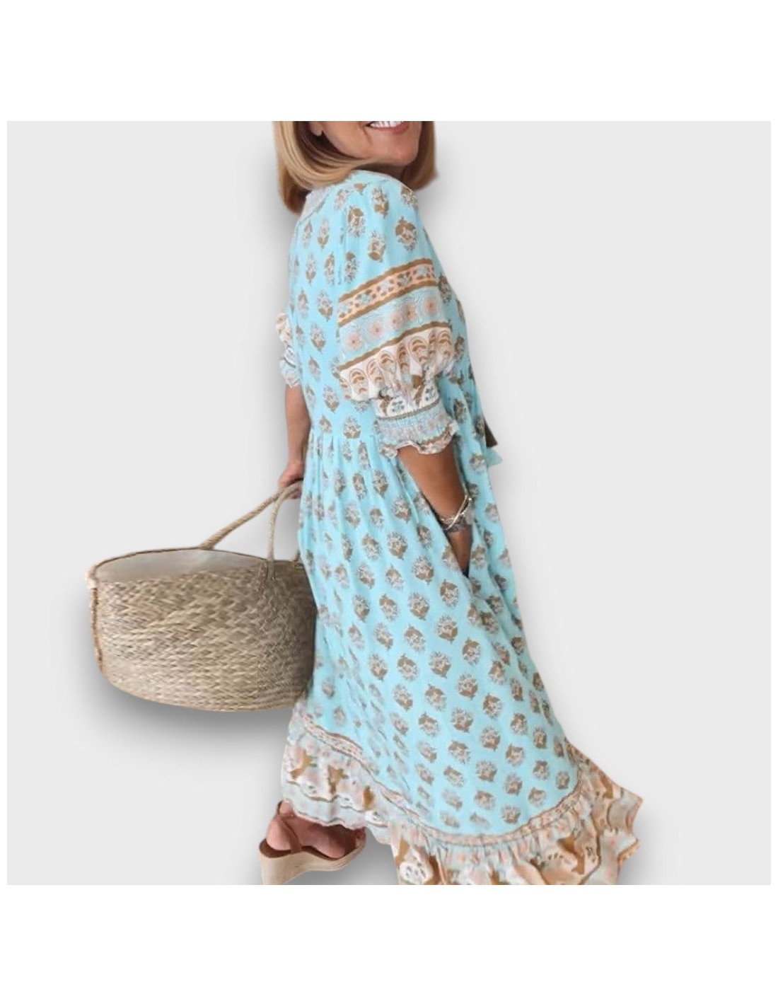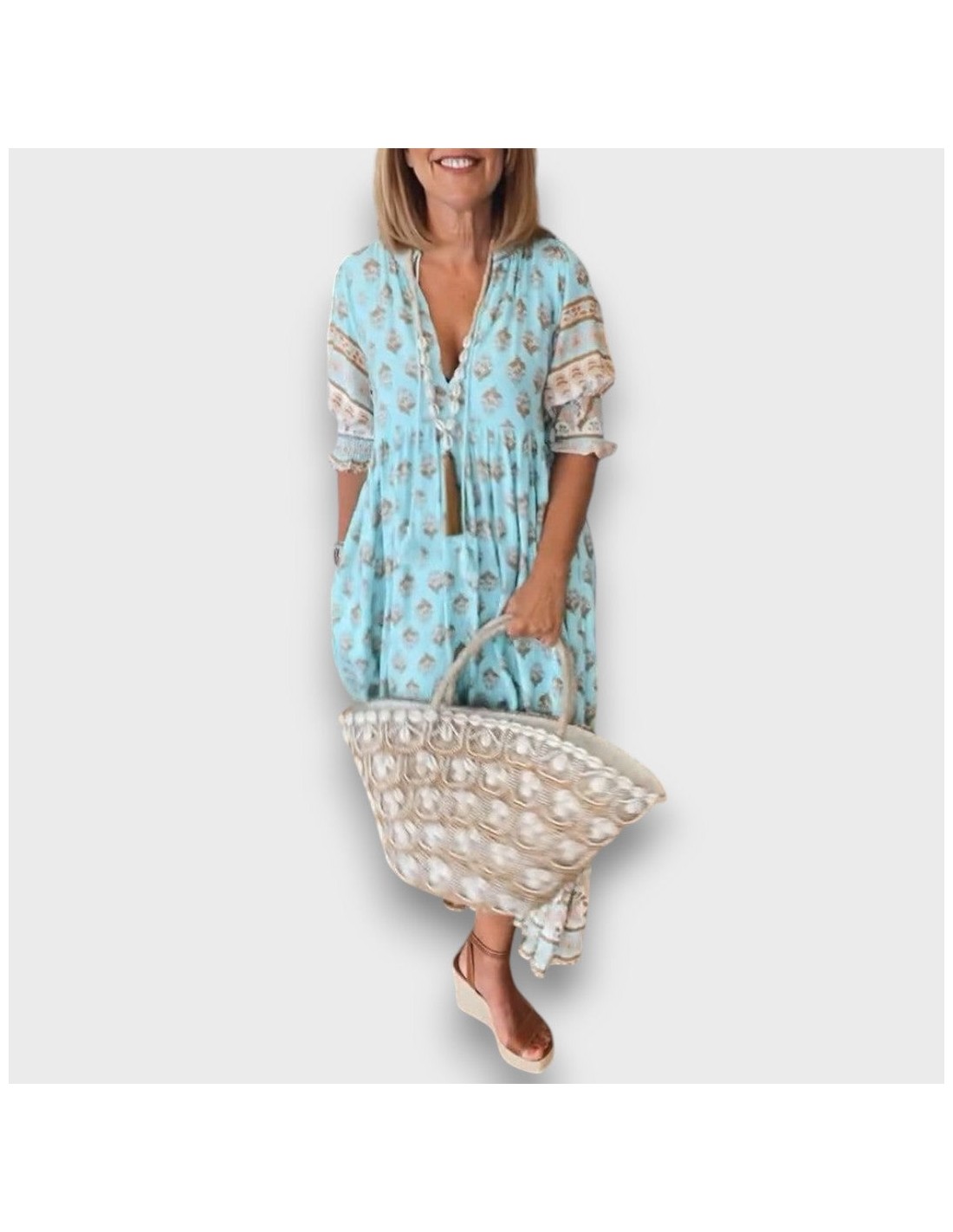 Vestido boho azul com padrão floral, corte fluido e mangas 3/4. Leve, confortável e ideal para dias de verão com estilo e frescura.