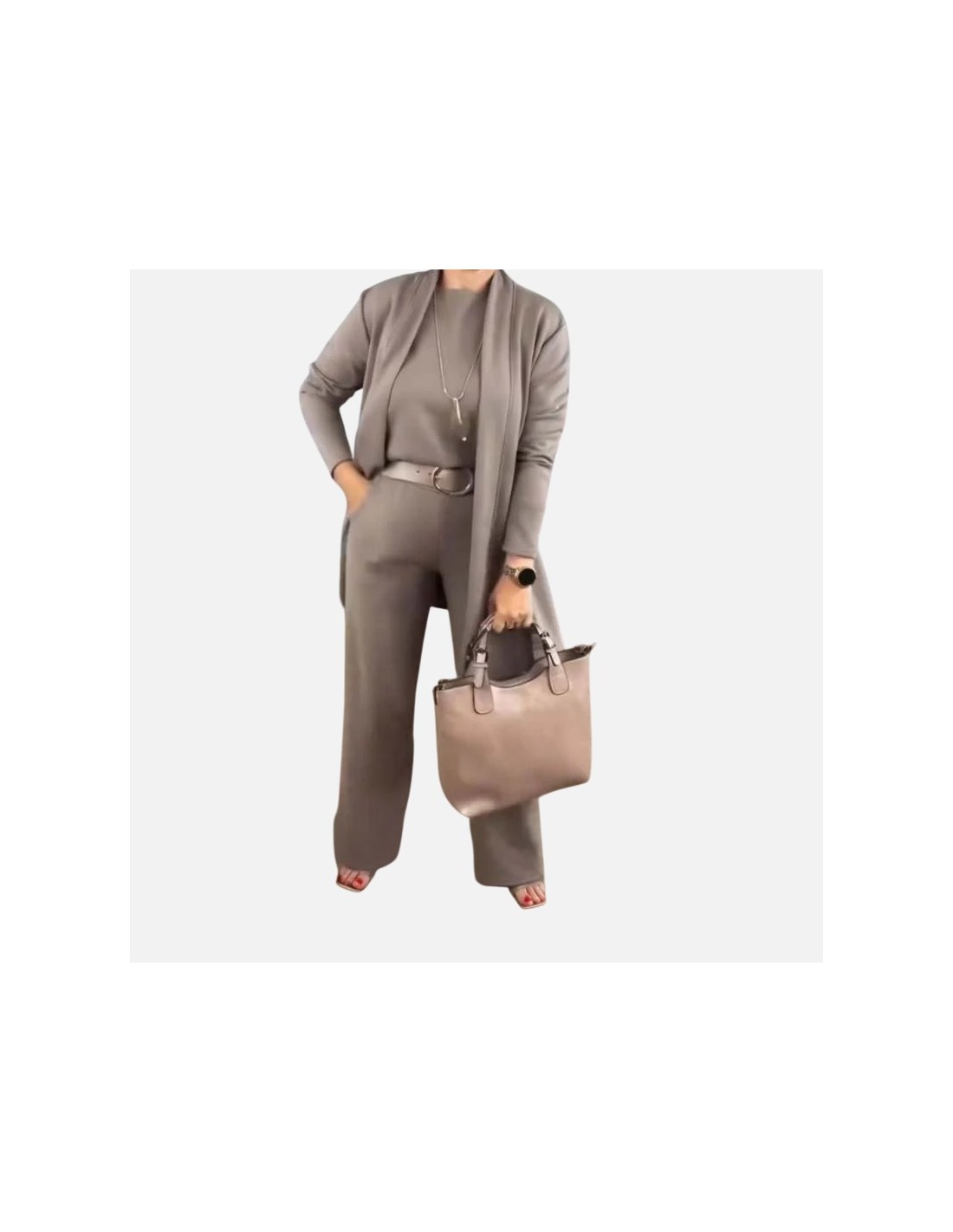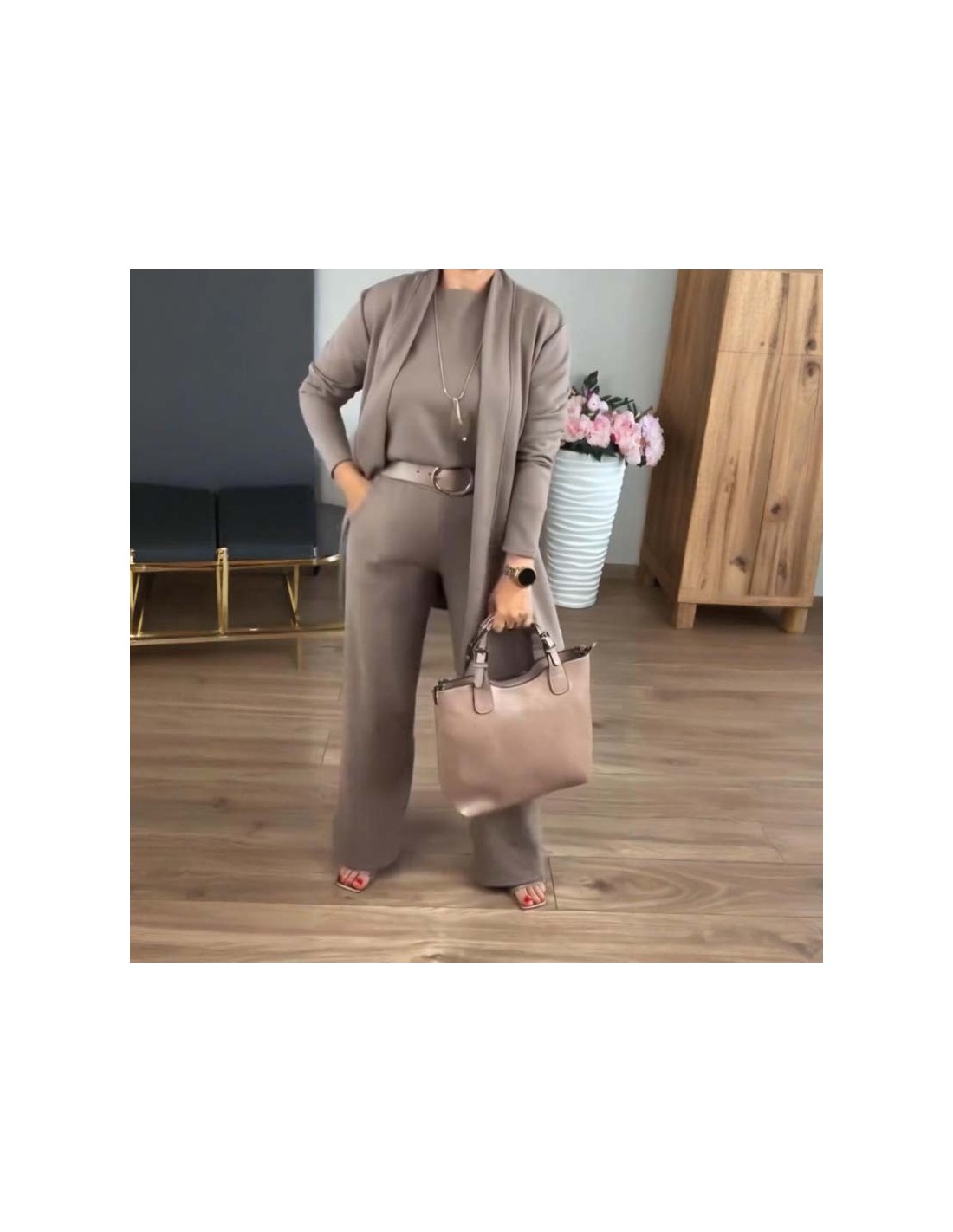 Um conjunto sofisticado que une estilo e praticidade em cada detalhe. Composto por calças de corte reto, uma blusa minimalista e um casaco fluído, este coordenado é a escolha perfeita para quem procura um look moderno sem esforço. O design versátil permite criar diferentes combinações, desde visuais casuais até opções mais elegantes para o dia a dia ou ocasiões especiais.