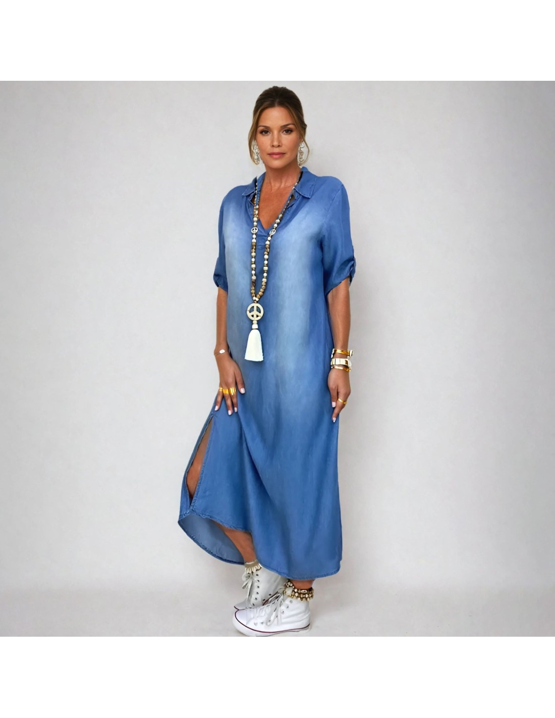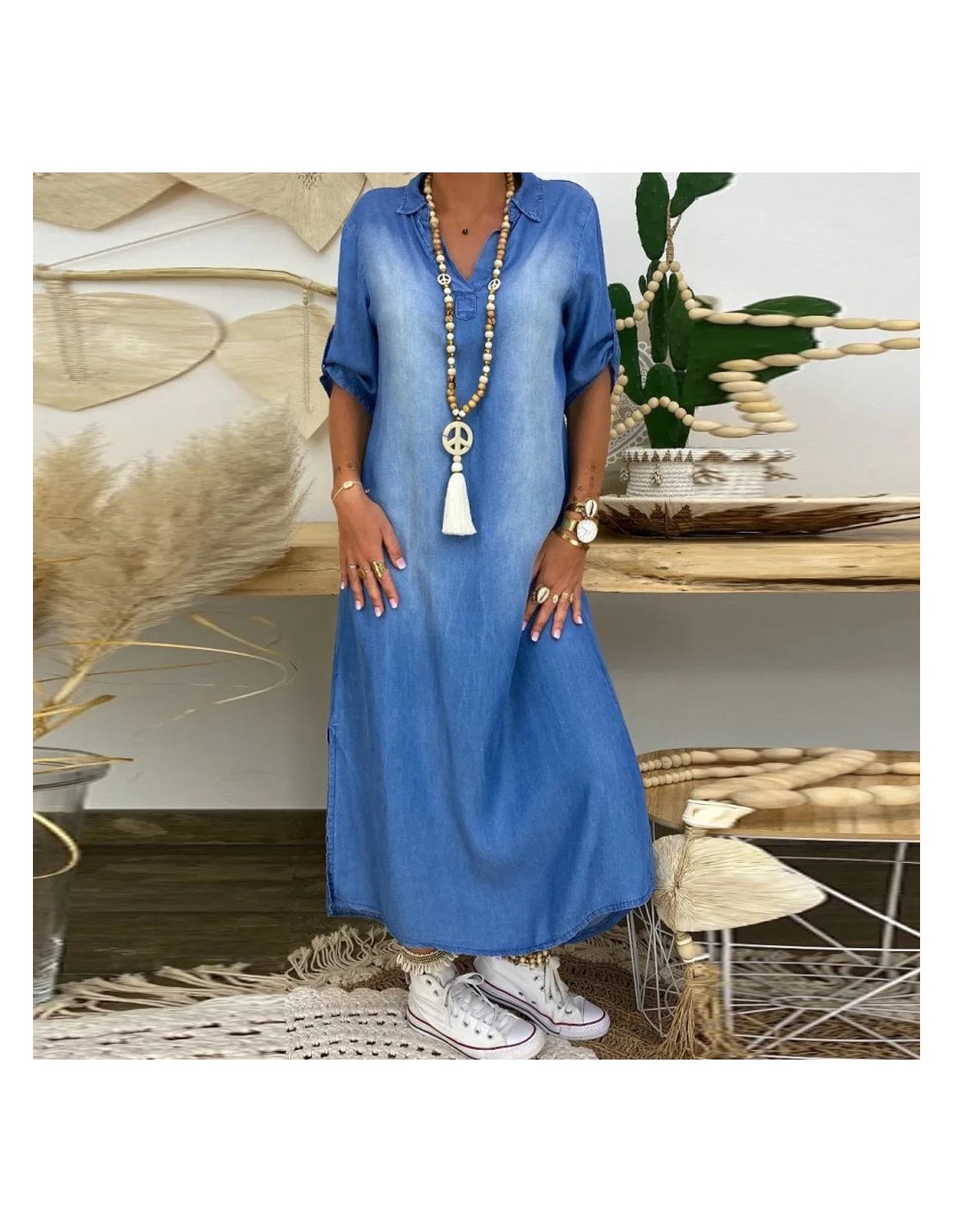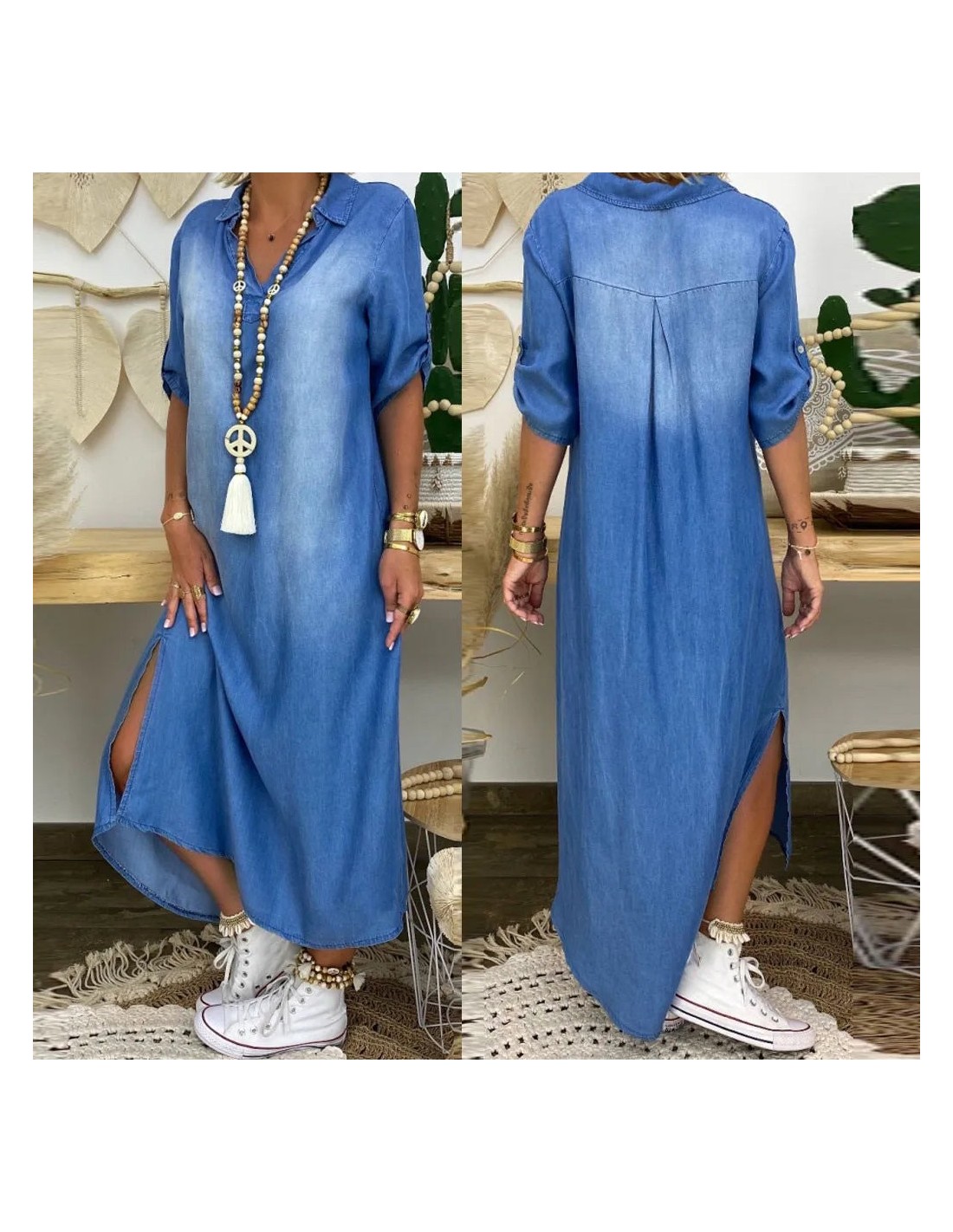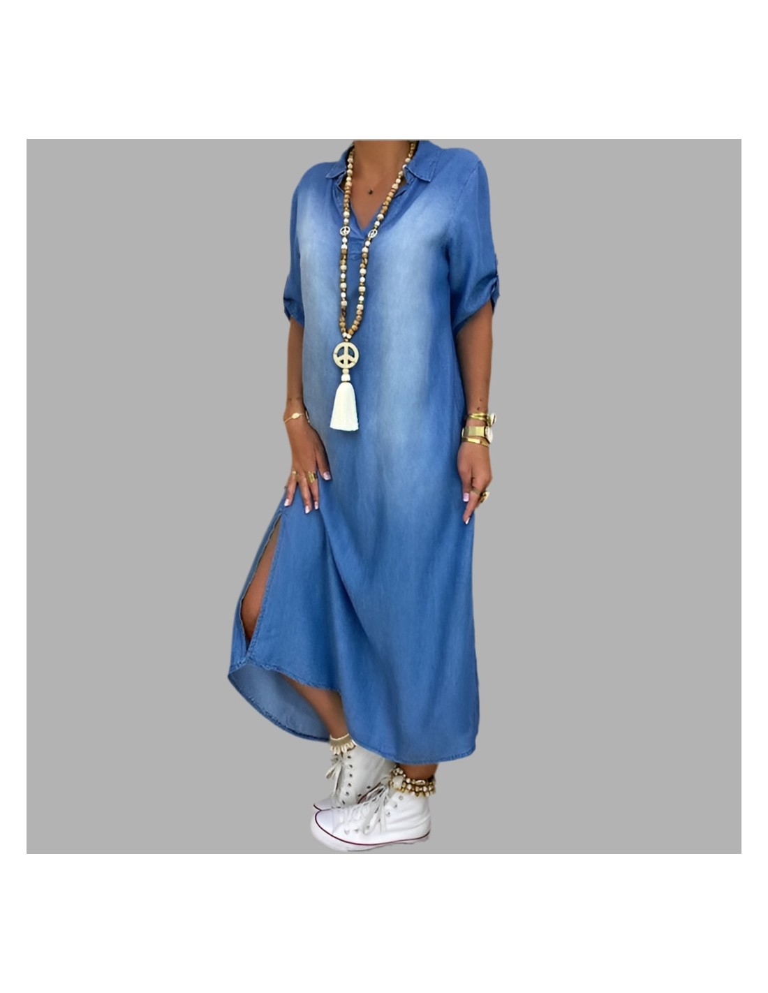 Vestido camiseiro feminino azul com gola clássica, decote em V e abertura lateral. Leve, fresco e elegante, ideal para looks casuais ou ocasiões especiais. Um vestido versátil e confortável que combina estilo e modernidade.